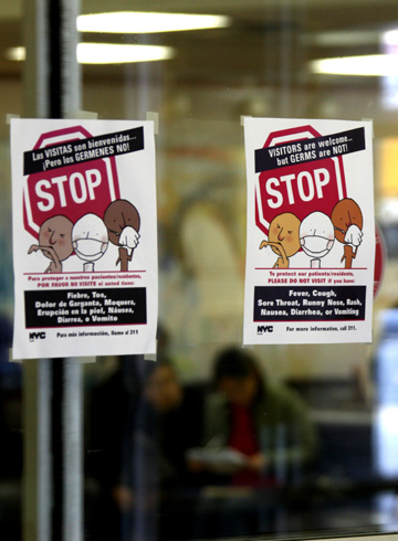 美国纽约皇后区的一家医院玻璃门上贴着一则提醒人们有打喷嚏、咳嗽等症状时应该戴上口罩、使用纸巾或袖子进行遮挡的小告示。新华社记者 刘欣 摄