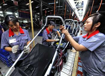 8月10日,福建晋江民营企业三力机车有限公司工人在生产出口产品割草机。在世界金融危机的背景下,拥有大小民营企业1万多家的福建省晋江市民营经济仍然保持稳步发展态势。新华社记者张国俊摄