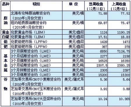受投资者担心能源需求疲软和美元持续走强等因素的影响,当周国际油价连续5个交易日出现下滑,并且纽约市场油价跌破了每桶70美元的关口。美联储主席伯南克在华盛顿经济俱乐部发表演讲时表示,美国经济目前还面临着就业市场不振、居民消费意愿不高和信贷市场紧缩等一系列问题,现在断言复苏是否能够持续还为时过早。他的这一表态加重了市场投资者对原油需求恢复前景的忧虑,打压油价走低。另外由于美元走强,以美元计价的油价出现回落。 当周国际金价连续大幅下跌,比月初创下的最高历史纪录已下挫逾100美元,这主要是因为近期美元的上涨,压低了投资者买入黄金保值的需求。分析人士指出,现阶段关于是否会爆发债务危机的担忧情绪正在蔓延,在市场没有明朗化之前,金价仍有下跌的可能。 伦敦金属交易所(LME)的铝库存持续下降,因此铝价升至2008年10月份以来的最高水平——每吨2277美元。其他基本金属的价格则普遍下跌,但有分析人士认为,长远来看,当前基本金属价格回调,仅属上涨趋势中的暂时回调,大方向上仍具备较大上涨空间。 分析人士指出,当周能源、金属和农作物的价格调整是必要的,因为自9月底以来,这些商品的价格在几无中断的情况下连续上扬,商品价格的跌势或将延续至年末,因为市场对表明需求迟滞的原材料库存高筑现象做出反应,而交易商则赶在年底前轧平仓位。若明年以后出现力道特别大的经济复苏,尤其在新兴市场,将可能促使原材料需求激增。