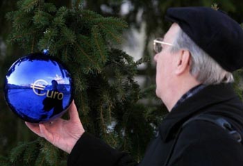 一名老人饶有兴味地欣赏一只印有欧元符号的圣诞树挂饰。新华社发(资料照片)