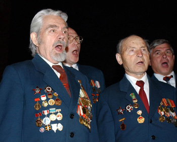 2003年6月22日,佩带勋章的红军老战士在俄罗斯首都莫斯科胜利公园的卫国战争纪念馆内演唱当年的战歌。当天是苏联卫国战争开始62周年纪念日。新华社记者 张维革/摄 |