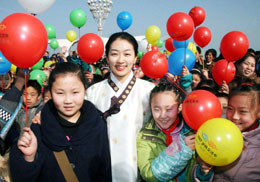 2月7日,烟台小朋友和一名韩国旅游小姐合影留念。当日,中韩旅游交流活动启动仪式在山东烟台滨海广场举行,中韩两国旅游界人士及观众近千人参加了启动仪式。