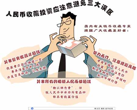 专家提醒广大收藏爱好者:收藏是一门学问,新手应该弄清楚人民币收藏的一些基本概念,提高鉴别意识,以免上当受骗或走进投资误区。 张培成提出,人民币收藏投资应注意避免三大误区: 第一,并非所有的旧版人民币都值钱。“物以稀为贵”,旧版人民币中并非所有品种都具有收藏价值。以即将退出流通领域的第二套人民币纸分币为例,纸币上罗马文带有阿拉伯数字的1分、2分、5分纸币由于当初发行数量很少,收藏价值就高,目前价格都在200元以上。而没有印数字的纸币,5分纸币价格在1元左右,2分纸币价格为0.1元,1分纸币价格仅为0.07元,差别非常大。 第二,并非整套收藏才值钱。有的收藏者拿着零散旧版纸币到市场上兑换,可能会遇到商家以“不是整套”而压低价格,这时没有经验的新手可能会接受商家的出价而导致上当。张培成告诉记者,有些版本的人民币,由于具有很高的稀缺性,不需要“成套出售”,本身价值已经比较高了。如众所周知的第一套人民币价格在160万元左右,其中四张一万元“牧马图”、一万元“骆驼队”、五千元“蒙古包”和五百元“瞻德城”已经价值五六十万元。因此收藏者在兑换前一定要弄清楚手中人民币是否是珍品,以免利益受损。 第三,量力而行,注意规避风险。张培成介绍说,人民币收藏爱好者分为两类人,一类经济条件较好,遇上自己喜欢的品种愿意花高价购买,然后长期收藏,对价格涨跌并不十分在意;第二类就是希望通过投资人民币收藏,低买高卖获得回报。对于大多数个人和家庭而言,如果将人民币收藏作为投资理财的手段,就要注意量力而行,因为所有的收藏都不会只涨不跌,如果盲目追求差价利益,同样也会被“套牢”。因此,普通家庭投资人民币收藏,应该注意控制资金的投入,并随时关注市场行情。