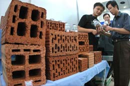 南京一家新型建筑材料公司在展示该公司利用页岩和尾矿等矿山废弃物开发研制的各种节能墙砖。(本报资料照片) |