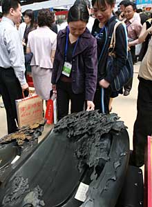 5月18日,几名参会人员在徽商展会上欣赏歙砚。新华社发(潘成