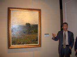 范建祥向参观者介绍他收藏的俄罗斯油画作品。 | 范建祥创办的股份制连锁企业“东方茶楼”在俄罗斯很有名。然而,14年的创业所得,他几乎都投在了收藏上。