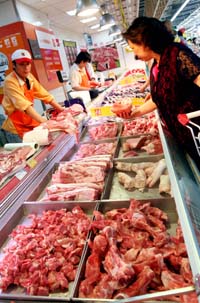 上海猪肉价格涨至近年来最高点,同比上涨七成左右。消费者在上海一家大型超市内选购生猪肉。本报记者:刘颖 摄 |