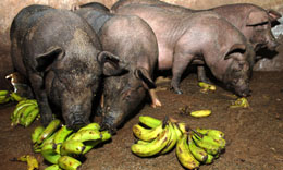 6月12日,琼海市塔洋镇农民用香蕉喂猪。海南香蕉由于受到各种因素影响,近期价格持续低迷,让蕉农一筹莫展。本报记者:赵颖全