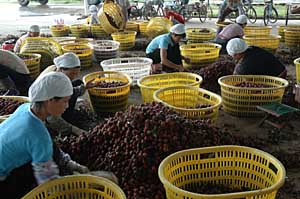 | 荔枝浓缩汁加工厂的工人正在分拣荔枝。荔枝深加工被认为是解决荔枝销售的主要出路。梁思奇