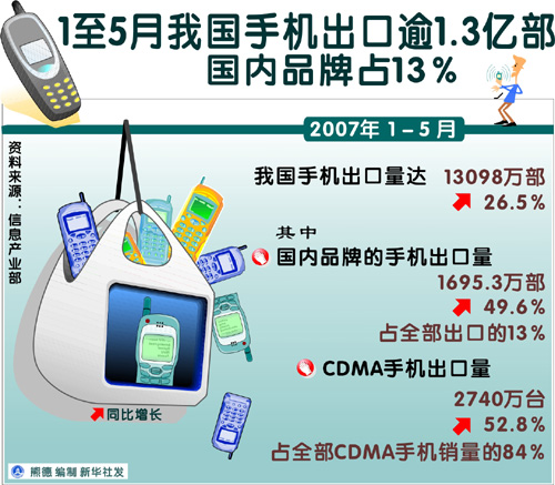 1至5月我国手机出口逾1.3亿部国内品牌占13%