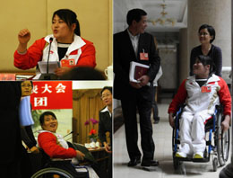左上:这是边建欣在分团讨论会上发言。左下:边建欣在工作人员的帮助下来往于住处和会场之间。右图:讨论结束后,坐在轮椅上的边建欣和代表边走边聊。