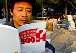 1月1日,来自四川渠县的外来工肖光明在福州街头工作休息时阅读劳动合同法的相关问答。当日,《中华人民共和国劳动合同法》正式施行。