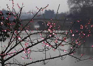 | 西湖风景区内的盛开的红梅吸引了众多游客前去观赏。新华社记者 徐昱