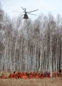 武警内蒙古大兴安岭森林支队官兵在扑火前线(4月20日摄)。