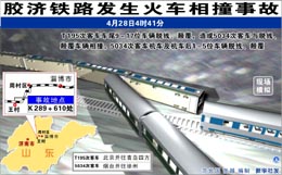 28日凌晨4时48分,北京至青岛的T195次下行到胶济线周村至王村区间时,客车尾部第9节至第17节车厢脱轨,与上行的烟台至徐州的5034次旅客列车相撞,致使机车和五节车厢脱轨,造成重大人员伤亡。到晚间发稿时为止,已死亡70人,伤416人。其中有4名法国旅客受伤。 记者在现场看到,从北京至青岛的T195次列车有8节车厢倾覆到铁路一旁。与其发生碰撞的5034次从烟台至徐州的火车,至少有4节车厢脱轨。 淄博中心医院副主任医师徐东谭14时在现场接受记者采访时说,他从早6时就来到现场,负责将伤员分派到各家医院。已有110多名伤员经他的手被分派往多家医院救治。他说,伤员多是面部受伤、受撞击骨折等。 据初步调查显示,这是一起人为责任事故。铁道部已作出决定,免除济南铁路局党政主要负责人的职务,接受审查,听候处理。 据了解,胶济线周村至王村区间限速为每小时80公里。北京至青岛的T195次下行通过时达到每小时131公里。事故详细原因正在调查中。