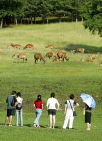 昔日地广人稀、寒冷原始的“北大荒”,如今随着各类天然而充满特色的旅游项目开发,正在成为中国新的旅游胜地。图为游客们在伊春市一个天然鹿场观赏鹿群。 |