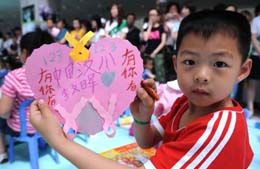 6月1日,参加活动的小朋友在展示自己绘制的祈福卡。当日,中国人寿天津市分公司与天津市青少年活动中心共同举办“真情六一、祈福灾区”主题公益活动。来自天津各区县的150多名少年儿童代表参加活动,表达对灾区小伙伴的节日祝福。新华社记者:刘海峰 摄