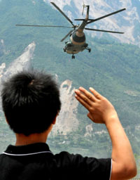 直升机为抗震救灾作出了突出贡献,赢得了灾区人民的崇敬。新华社记者:杨俊江 摄 |