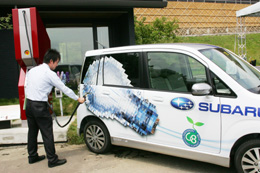 日本在八国峰会上展示电动及电燃混合动力汽车。7月8日,工作人员为一辆电动车充电。这种像加油机的充电器15分钟可完成一辆电动车的充电。电动车一次充电可行驶80公里。可以预测在油价不断高涨的情势下,各国都在通过征收燃油税等政策措施和加快研制电燃混合动力汽车等技术手段,推动节能进程。新华社记者:王成云