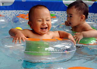 | 7月10日,在育儿专家及专业婴儿护理人员辅导下,13个月大的幼儿琛琛(前)和小伙伴一起,在水中嬉戏。新华社记者 张旭