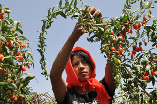 7月18日,一名外地打工姑娘在宁夏中宁县舟塔乡万亩采摘枸杞。被誉为“中国枸杞之乡”的宁夏中宁县枸杞种植面积已发展到16万亩。这个县的枸杞不但在国内各大中城市入超市、上餐桌,还出口美国、日本、南非、澳大利亚等23个国家和地区,年出口总量达5000余吨,综合产值达10亿元。新华社记者:刘泉龙