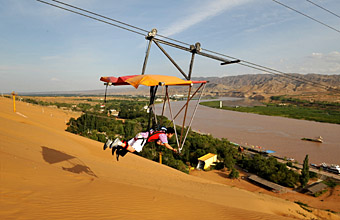 | 游客在宁夏沙坡头风景区的空中索道上“飞翔”。 |