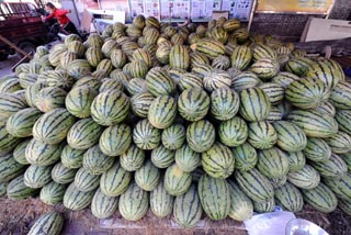 8月31日,在山西省太原市东岗路集贸市场,一名小孩在一处西瓜摊点旁玩耍。近日,财政部、国家发改委、国家工商总局联合发出通知,决定从2008年9月1日起在全国统一停止征收个体工商户管理费和集贸市场管理费。