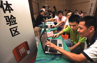 浙江启动“百场万企”电子商务系列培训。9月10日,工作人员(前右二、右四)在培训浙江的中小企业负责人运用网络做生意。新华社记者:谭进