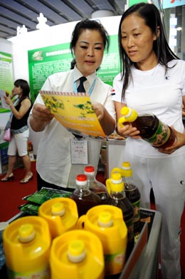 西部少数民族特产勇闯中博会。9月23日,来自贵州省绿原食品开发有限公司的业务员在展会上向客商推介野生刺梨果汁。新华社记者:周文杰