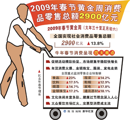2009年春节黄金周消费品零售总额2900亿元