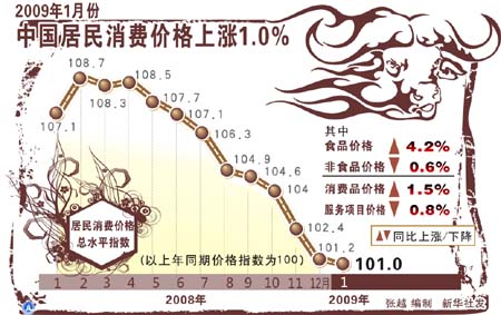国家统计局10日公布,1月份我国居民消费价格(CPI)同比上涨1%,涨幅比上月下降0.2个百分点,碰触到通货紧缩的预警线;工业品出厂价格(PPI)同比下降3.3%,降幅比上月扩大2.2个百分点。数据显示,当前我国通货紧缩的风险正在增大。与之对应,市场预期央行未来将再次降息。