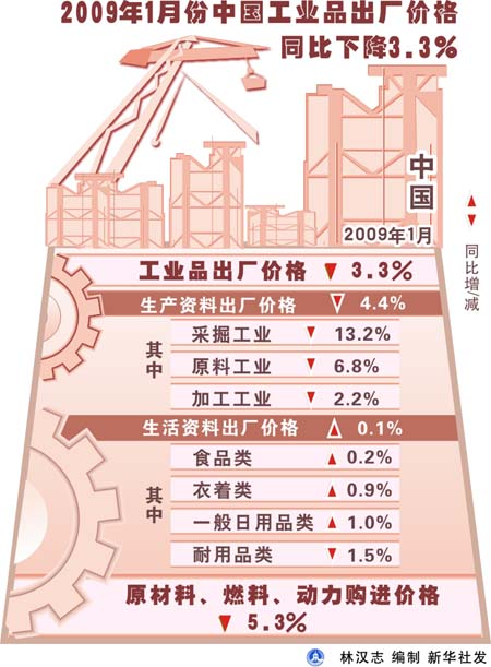 1月份PPI降幅比上月扩大2.2个百分点,出乎绝大多数研究人员的预料。原因何在?国家统计局给出了两点解释: 一是美国金融危机引起全球实体经济快速下滑,国际市场原油、矿石、粮食等基础性产品价格显著下降,致使我国此类大宗产品进口价格明显下降,进而引起去年持续处于高位的生产资料价格下降较多,并通过产业链条逐渐往中下游传导,导致主要类别产品价格的全面走低。比如,1月份,国际市场上非能源价格同比下降25.5%,降幅比12月份扩大1.2个百分点;金属价格下降41.4%,扩大5个百分点,其中铝价下降42.2%,扩大5.3个百分点。 二是去年价格高企的负滞后影响。2008年工业品出厂价格前8个月涨幅逐渐扩大,形成了一个较高的基数平台,9月份以后工业品出厂价格开始环比下降,2008年12月份的平均价格水平已低于2008年1月份的水平,致使2008年的工业品价格变动对2009年的滞后影响为负,全年大约为负4.3个百分点。其中,2008年对2009年1月份的滞后影响大约为负1.5个百分点,并且这种负的滞后影响在2009年8月份以前还将逐月扩大。因此,即使2009年工业品价格不再下降,全年的工业品价格同比涨幅仍然为负,表现为2009年工业品价格同比指数的明显下降。 另外,统计局强调,从分类上看,PPI价格有涨有落。在工业品出厂价格中,尽管黑色金属冶炼及压延加工业出厂价格和有色金属冶炼及压延加工业出厂价格同比分别下降7.2%和24.6%,但煤炭开采和洗选业出厂价格同比上涨22.7%,其中原煤出厂价格上涨12.3%;汽油、煤油出厂价格分别上涨2.1%和3.1%。