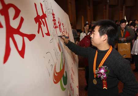 首届“中国十佳大学生村官”颁奖典礼上,“中国十佳大学生村官”获得者在《创业新农村,奉献写青春》倡议书条幅上签名。新华社记者:袁满 摄