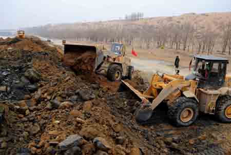 3月11日,在黄河内蒙古达拉特旗昭君坟段,工程机械正在打堤坝,建造蓄滞洪区。 为减轻黄河内蒙古段防凌压力,内蒙古自治区在黄河南岸的杭锦旗和达拉特旗抢修3处分凌蓄滞洪区,以预防可能到来的特大凌汛。据介绍,这3个蓄滞洪区可分凌近1.4亿立方米。