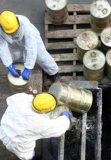 3月11日,身穿防化服的技术人员将易制毒化学品倒入回收容器。当天,天津市公安局缉毒处集中销毁重量达8.7吨、价值百余万元的易制毒化学品。销毁工作先添加化学试剂,然后用高炉高温处理,不会对环境造成污染。