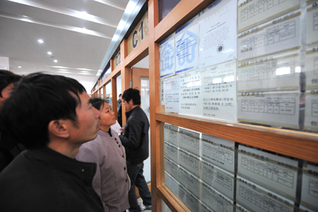 农民工正在杭州市外来劳动力服务中心仔细查看招工信息。本报记者:傅丕毅
