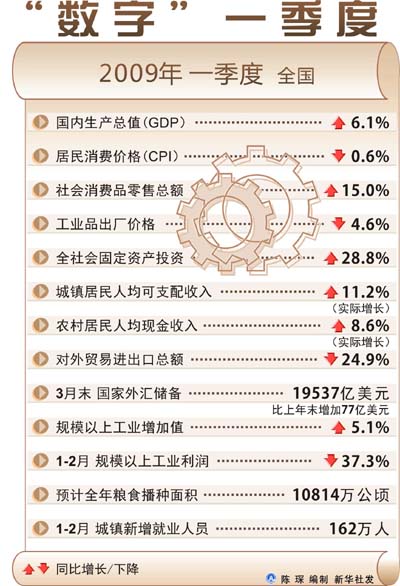 国家统计局16日公布的一季度经济运行数据显示,2009年一季度我国GDP增速为6.1%,今年一季度的经济增长率比去年四季度回落了0.7个百分点,而去年四季度比三季度回落了2.2个百分点,经济大幅下滑之势明显收敛。 根据国家统计局测算,一季度6.1%的经济增速中,4.3个百分点来自消费,2个百分点来自投资,而出口的贡献为负0.2个百分点。投资增速和社会消费品零售总额实际增速“双加快”,支撑起国际金融危机冲击下的中国经济增长。 一季度,全社会固定资产投资同比增长28.8%,比去年同期加快了4.2个百分点。其中,新开工项目计划总投资增长87.7%,铁路投资增长102%。这说明,从去年底开始实施的4万亿元投资计划的效应正在逐步显现,新项目密集开工,基础设施投资猛增。 国家统计局新闻发言人李晓超说,中央扩大投资的政策效果将继续发挥作用。去年中央扩大投资的1000亿元已全部落实,今年初的1300亿元投资计划也已下达了1100亿元。未来投资仍会保持快速增长势头。
