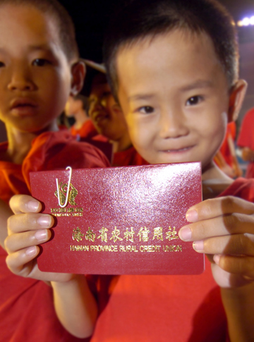海南省近日启动首届“我爱海南”资助百名孤儿捐助仪式,海南各市县的100名孤儿将受到无偿资助直至大学毕业。图为一名孤儿手拿爱心企业捐助的银行存折。 新华社记者 郭程 摄