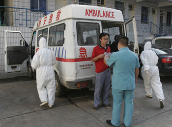 8月30日,河南省新安县医护人员准备去接转甲型H1N1流感疑似病人。 河南省新安县第三高级中学8月28日起发生一起甲型H1N1流感暴发疫情。根据河南省卫生部门统计,截至8月30日,共发现确诊病例80例。患者分别被安排在新安县4家医院隔离治疗,病情稳定。新安县政府目前已成立应急指挥部,并决定对该学校所有学生放假一周。