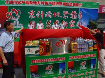 8月31日,什邡进京销售的农产品及地方特色产品在启动仪式上亮相。 当日,“什邡市农产品及地方特色产品进京”启动仪式在北京举行,首批到京销售的产品包括10个系列50多个品种,价值1000多万元。这项活动是北京援建地震灾区的一项新举措,既可以支持什邡全面恢复生产、增加农民收入,也为北京市民提供了优质的商品。