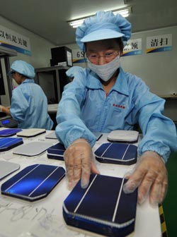 一位工人正在温岭市宝利特新能源公司车间里工作。浙江部分传统企业进军新能源产业。宝利特等传统制鞋企业转产研发太阳能电池片和组件,企业年生产能力超过20兆瓦。新华社浙江分社供稿 |