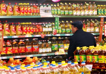 继花生油涨价后,上海食用油市场的大豆油也启动新一轮涨价。记者在一家大型卖场了解到,目前部分品牌的大豆油已完成调价,涨幅约10%,而其余品牌也计划于近期将陆续上调零售价。图为顾客在一家卖场内选购食用油。新华社记者