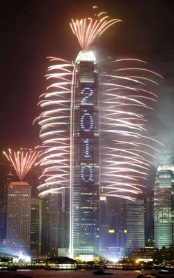 1月1日凌晨,香港维多利亚港举行迎新年烟花灯光汇演,庆祝2010年元旦的到来。新华社记者 吕小炜