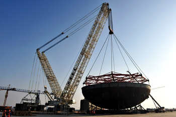 4月9日,3200吨履带式大吊车正将直径(内径)39.6米的CV底封头从运输车上吊起。当日,建设中的山东海阳核电站项目一号核岛重大节点工程CV(钢制安全壳)底封头成功实现整体吊装。新华社记者 李紫恒/摄 |