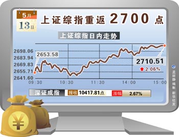 5月13日,受央行在公开市场投放资金、主板市场暂停新股发行传闻以及美国道指收复上周全部跌幅等利好消息的影响和提振,A股市场终于迎来技术反弹。其中,沪指在时隔18个交易日后重新登上5日线,并且重新站上2700点整数关口,市场重心有所上移。 统计数据显示,当日沪综指开于2653.58点,最高2711.07点,最低2646.90点,收于2710.51点,涨54.79点,涨幅2.06%,成交额907.36亿元;深成指开盘10161.18点,最高10417.81点,最低10114.68点,收于10417.81点,涨271.17点,涨幅2.67%,成交额633.24亿元。 从盘面看,石化双雄、银行、有色金属等权重板块的集体拉抬为大盘重新企稳奠定了基础,再加之智能电网、西藏、新材料、低碳、医药等中小盘股集中的众多板块也相继企稳,市场做多热情重燃。 其中,银行股活跃,深发展A、交通银行、中国银行、工商银行等银行股大幅上涨,带动金融板块全线飘红。煤炭板块强劲上扬,国投新集领涨,高开高走涨逾7%,西山煤电、潞安环能、国际实业、上海能源、平煤股份等涨逾5%。有色金属板块午后崛起,西藏矿业、包钢稀土、章源钨业涨停,中孚实业、厦门钨业、贵研铂业、东方钽业、宝钛股份等涨逾6%。化纤板块强势,华峰氨纶涨停,华西村、海利得、烟台氨纶、澳洋科技等涨逾6%。截至收盘,化纤板块涨4.04%,位于涨幅榜第一。 中国人民银行当天发行了200亿元3个月期央票,并进行了300亿元的91天期正回购操作;加上本周二发行了140亿元1年期央票,使得本周公开市场合计回笼资金仅为640亿元。同时,由于本周到期释放资金量高达2160亿元,这就意味着本周净投放资金规模达到1520亿元,结束了连续11周以来的资金净回笼格局。 当天还有传闻称,由于新股频频破发,使得管理层有暂缓主板新股发行的意图。对此,世基投资认为,其实结合2008年熊市管理层对市场公开操作来看,停发新股IPO的可能性是很大的。特别是在目前欧美重陷债务危机,我国经济有面临二次探底可能的关键时候,资本市场的稳定尤为重要。 在周四发布的报告中,中金公司明确表示,权重股表现较好不代表利空已消化完毕,前期强势个股显示补跌的迹象,当前保持低仓位仍然是好的投资策略。中金公司认为,弱市中不存在持续的防御性板块,以医药板块为例,此轮调整以来医药板块表现明显好于大盘,但目前医药股相对于大盘的估值溢价已经非常高,在股指持续下跌的情况下,医药股同样存在补跌的压力。 爱建证券分析师袁俊认为,从技术指标看,沪指只要不跌破2673点则意味着从3157点开始的下跌暂告一段落,后市个股将呈现分化走势。但是要提醒的是中小板的部分公司大小非即将开始流通,建议投资者密切关注相关大小非的动向,毕竟以后大小非对于股票的波动会有较大的影响。 根据平安证券策略分析师蔡大贵的判断,上证指数在2600点左右形成了较强的支撑,具备反弹基础。反弹的空间不会很大,估计在10%左右,可能是以较为反复的形式进行。新兴产业等中小市值概念股仍是市场关注焦点,目前市场还不具有推升大盘权重股的条件。
