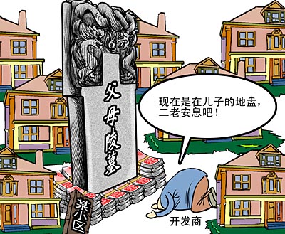 长沙一房地产开发商在自己开发的楼盘小区里,为父母建了一座豪华陵墓,据说修陵墓花了100多万元。(新闻晨报3月19日报道) 先不说这位开发商的行为是否违反了殡葬管理条例禁止在铁路公路主干道两侧、住宅区新建公墓的相关规定。就说这种在居民小区内私建“死人建筑”,其实也向物权法提出了挑战。根据物权法规定,小区绿地、物业服务用房、公共场所等公共设施应归业主所共有。 开发商虽然在获得相关批准之后有权开发一块土地,甚至有权对小区内格局进行规划,但并非权利大到什么都能建的地步。而相对于比较弱势一方的小区业主而言,在物权范畴里需要完善法律规定来维护自己的权利。 | |