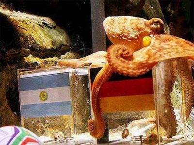 南非世界杯让章鱼保罗名震全世界。对于万千球迷来说,吸引他们的不仅是赛场上扣人心弦的比赛,还有那位生活在德国的奥博豪森水族馆中名叫保罗的章鱼哥。章鱼哥保罗生于英国,在德国长大。保罗在南非世界杯上成功预测德国胜澳大利亚、加纳,输给塞尔维亚的小组赛赛果;在世界杯1/8决赛中,德国队胜英格兰;在世界杯1/4决赛中,德国队击败阿根廷队;紧接着章鱼哥又成功预测半决赛德国对战西班牙0:1告负;三四名争夺战中成功预测德国击败乌拉圭;最终决赛中成功预测西班牙战胜荷兰夺得大力神杯。