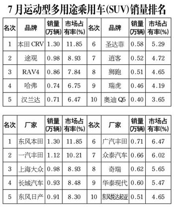 7月运动型多用途乘用车(SUV)销售表现突出,销售10.97万辆,环比下降1.57%,同比增长86.63%,远高出乘用车销售平均水平。 7月份,在SUV销量中,2.0L排量车型热销势头未退,所占比例为46%。其次是2.4L排量车型,销量占比为20.76%。在其他车型环比均现不同程度的下滑后,SUV的环比增幅显得较为抢眼,因此其也成为乘用车市场中产销环比以及同比增幅最大的车型。 途观是本月最大的看点,继6月之后再次超越RAV4,验证了途观的表现并非昙花一现。汉兰达、狮跑等车型,连续两个月跻身SUV销量第一梯队,代表欧美车型在国内主流SUV市场争得话语权。 与上月相比,SUV品牌前10位排名发生较大变化,仅有本田CRV保持不变,继续保持第一。途观、RAV4、圣达菲较上月上升一位,汉兰达上升三位,哈弗、逍客、狮跑下降两位,瑞虎和奥迪Q5进入前10,IX35和众泰5008跌出前10。 SUV企业前10位排名没有新进新出,但与上月相比,除了东风本田保持榜首不变外,其他各家名次均有变化;排名上升的有四家,其中广汽丰田上升四位,一汽丰田、上海大众上升两位,奇瑞上升一位。排名下降的有五家,其中东风悦达起亚下降三位,长城汽车、东风日产下降两位,众泰汽车、华泰现代下降一位。