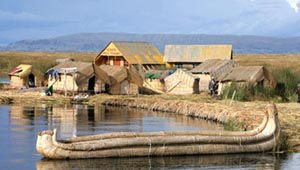 600多年前,为逃避西班牙和葡萄牙的殖民统治,乌鲁斯族人来到芦苇丛生的湖上,依湖而居,从此成为这里的主人。 起初的乌鲁斯人,用芦苇、蒲草编成厚实的芦席和蒲席,再编成草船,在船上生活。后来,他们把几条、十几条草船连在一起,成为更稳定的住所,浮岛就这样出现了。随后,他们又编出了精巧的房屋。现在,湖上的浮岛有60多个,小的有篮球场那么大,大的竟设有邮局、小学等公共设施。 踏上秘鲁的的喀喀湖上的浮岛,你会感觉天是那样近。脚下松软的芦苇蒲,不时发出“吱吱”声,诉说着在此繁衍生息几百年的乌鲁斯人的故事。湖面波光粼粼,穿着五颜六色民族服装的土著,是岛上最鲜活的景物。