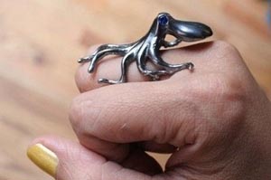 这个手上的小家伙一定是来自于海洋最深处,看上去是多么光滑又有别致。想要得到这个装饰戒指是要提前预定的,所以你可以提供自己的手指尺寸来量身定做一个。这个戒指的材质绝对是纯正的银,已经通过氧化处理,所以不用担心生锈的情况发生。章鱼眼睛的宝石是蓝色的,当然你可以选择自己喜欢的颜色来突出它的眼睛。